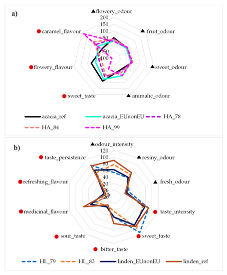 Independent prediction of the sensory parameters of the acacia (HA_78, HA_84 and HA_99) and linden honey (HL_79 and HL_83) can be seen in Figure 4, where taste parameters were independently predicted using PLSR models of ET and odour proportion PLRS models of EN (Table 6). The results of acacia honey showed that HA_99 honey was very different from the reference honey. However, HA_84 and HA_78 were similar to each other and to the reference honey sample. The results of linden honey showed that the HL_83 and HL_79 honeys were sweeter and weaker in other aroma properties than the reference linden honey, similarly to the EUnonEU blend of linden honey (HL_98).