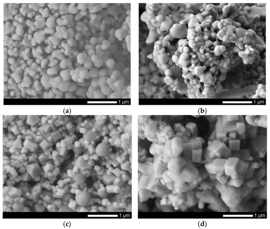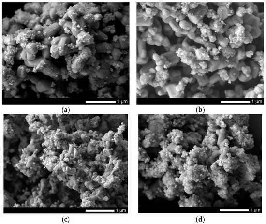 SEM images of synthesized nanoparticles: (a) FeCeOx nanoparticles; (b) 0.9FeCeOx + 0.1Nb2O5 nanoparticles; (c) 0.8FeCeOx + 0.2 Nb2O5 nanoparticles; and (d) 0.7FeCeOx + 0.3 Nb2O5 nanoparticles.