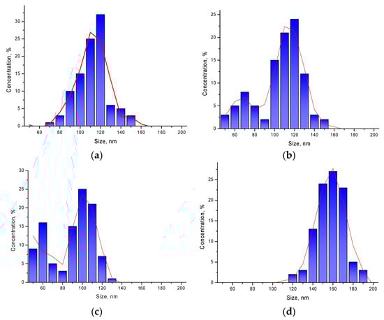 Diagrams of nanoparticle size distribution depending on the dopant concentration: (a) FeCeOx nanoparticles; (b) 0.9FeCeOx + 0.1Nb2O5 nanoparticles; (c) 0.8FeCeOx + 0.2 Nb2O5 nanoparticles; and (d) 0.7FeCeOx+ 0.3 Nb2O5 nanoparticles.