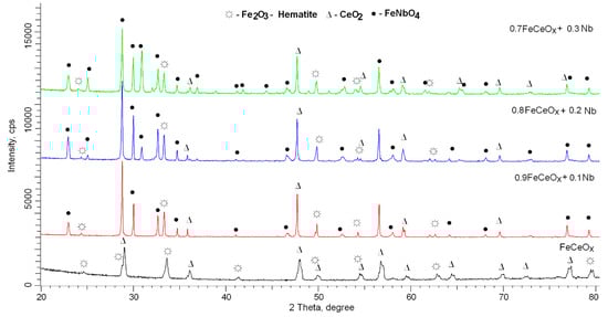 The synthesis of nanocomposites was carried out in two stages, including the chemical deposition of FeCeOx (which is a mixture of two phases Fe2O3 and CeO2) [26] and subsequent mechanochemical mixing of amorphous-like FeCeOx nanoparticles with Nb2O5 nanoparticles in the set stoichiometric proportions and thermal annealing in the air atmosphere at a temperature of 1000 °C within 8 h.