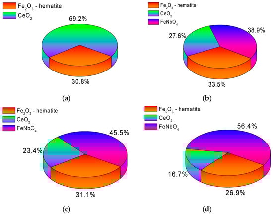 Phase analysis data obtained by analyzing X-ray diffractograms: (a) FeCeOx nanoparticles; (b) 0.9FeCeOx + 0.1Nb2O5 nanoparticles; (c) 0.8FeCeOx + 0.2 Nb2O5 nanoparticles; and (d) 0.7FeCeOx + 0.3 Nb2O5 nanoparticles.