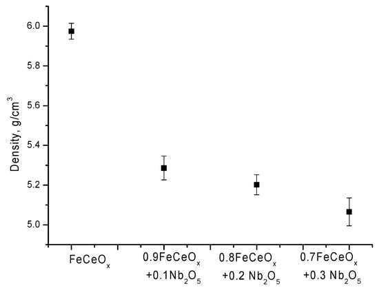 According to the data presented in the diffraction patterns, an increase in the concentration of the dopant Nb2O5 leads to the displacement of the CeO2 phase from the structure of nanoparticles, as well as to the dominance of the FeNbO4 phase. In this case, a change in the phase composition leads to a change in the density of nanoparticles, the data of which are shown in Figure 6.