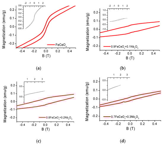 Hysteresis loops of the studied nanoparticles: (a) FeCeOx nanoparticles; (b) 0.9FeCeOx + 0.1Nb2O5 nanoparticles; (c) 0.8FeCeOx + 0.2 Nb2O5 nanoparticles; and (d) 0.7FeCeOx + 0.3 Nb2O5 nanoparticles.