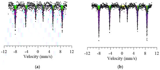 The estimation of the hyperfine magnetic parameters of the synthesized nanoparticles, as well as the effect of doping on the degree of magnetic disordering, was carried out by analyzing the Mössbauer spectra obtained at room temperature. The general view of the spectrum of nanoparticles in the initial state is characterized by the presence of two sextets of ultrafine magnetic fields of 515–516 kOe, which are characteristic of two types of ferromagnetic iron atoms (see Figure 8). The values of the hyperfine fields and also isomeric shifts for the initial nanoparticles are characteristic of structures such as hematite Fe2O3 with a partially disordered structure. Disordering and deviation of the hyperfine fields from the reference values of hematite is due to the presence of the CeO2 phase in the structure of nanoparticles. Additionally, the influence of the CeO2 phase on the degree of magnetic and structural ordering is evidenced by the ratio of the contributions of the partial spectra of two sextets 2.11:0.89, which is characteristic of the violation of stoichiometry at various levels of population in the A- and B-sublattices.