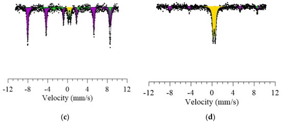 Mössbauer spectra of nanoparticles: (a) FeCeOx nanoparticles; (b) 0.9FeCeOx + 0.1Nb2O5 nanoparticles; (c) 0.8FeCeOx + 0.2 Nb2O5 nanoparticles; and (d) 0.7FeCeOx + 0.3 Nb2O5 nanoparticles.