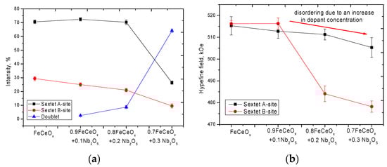 Changes in the hyperfine parameters of magnetic characteristics obtained on the basis of the analysis of Mössbauer data: (a) data of changes of contribution intensities of partial spectra depending on concentration of dopant Nb2O5; (b) data on changes in the magnitude of hyperfine magnetic fields in the A- and B- sublattices.