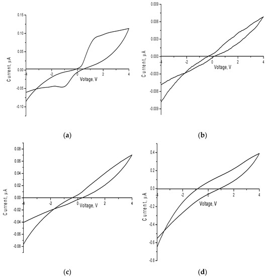 Graphs of cyclic voltammograms of the studied nanoparticles: (a) FeCeOx nanoparticles; b) 0.9FeCeOx + 0.1Nb2O5 nanoparticles; (c) 0.8FeCeOx + 0.2 Nb2O5 nanoparticles; and (d) 0.7FeCeOx + 0.3 Nb2O5 nanoparticles.
