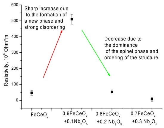 For doped nanoparticles, the character of the change in current-voltage characteristics is close to ohmic, without the obvious presence of regions with a quadratic dependence of the change in I on V. In this case, the formation of the FeNbO4 phase at low concentrations leads to a sharp increase in the resistivity of nanoparticles (see Figure 11). However, the dominance of the FeNbO4 phase, as well as transformation processes in the shape of nanoparticles, lead to structure ordering and a decrease in the resistance value.