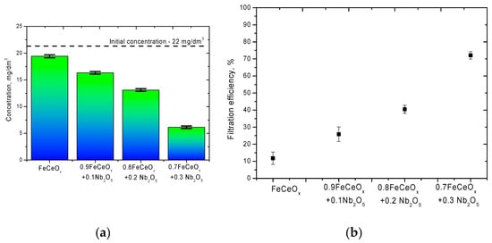 Due to the aforesaid, the purpose of this work is consideration of a possibility of increase in efficiency of filtration and cleaning of water environments by means of nanocomposites of FeCeOx doped by oxide of niobium (Nb2O5). The choice as a dopant is Nb2O5 due to its wide use as a doping element of various composite materials in order to increase photocatalytic activity, due to the small width of the forbidden zone, good resistance to degradation, as well as the possibility of obtaining spinel stable phases [21,22,23,24,25]. The relevance of the study is to assess the potential use of nanocomposites for the purification of aqueous media from pollutants such as manganese, which is one of the harmful metals concentrated in wastewater. The possibility of adsorption of manganese on the surface of nanocomposites and their subsequent capture by magnets can be further used on a semi-industrial or industrial scale.