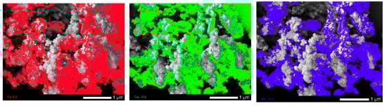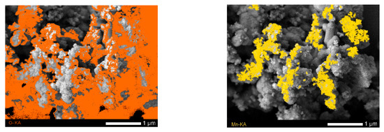 A direct confirmation of the fact that the formed small growths on the surface of nanoparticles are manganese are the data of the mapping results, which are presented in Figure 14, obtained from the 0.7FeCeOx + 0.3 Nb2O5 nanoparticles samples.