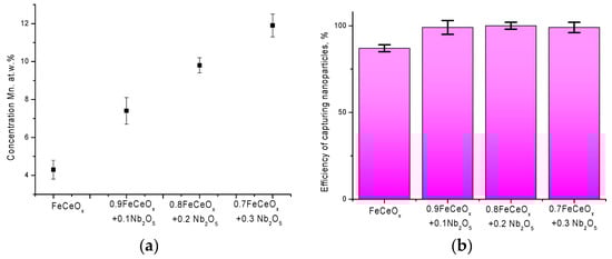Data of energy dispersion analysis and conservation of mass of nanoparticle samples after filtration: (a) graph of changes in the concentration of manganese on the surface of nanoparticles after filtration; (b) graph of the efficiency of capturing nanoparticles after filtration.