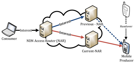 There have been several proposals put forth regarding NDN producer mobility. These can be divided into two categories: anchor-based schemes and anchorless schemes. Anchor-based schemes [8,9,10,11,12] introduce an anchor (or a rendezvous server) to track the current locations of contents. The anchor stores the binding information for content and its location. The anchor usually interacts with the mobile producers to maintain updated binding information. Anchor-based schemes resemble the Home Agent, as defined in [13,14]. However, it causes suboptimal routing problems and signaling overhead. In anchorless schemes [15,16], mobile producers send special announcements to the previous NAR whenever they change the point of attachment. Therefore, all NDN routers on the signaling path must understand the meaning of the special announcements. Consequently, the anchorless schemes modify the NDN router architecture so that it can handle both ordinary Interests and Interests that require redirection. This may break the simple architecture principle of NDN [17].