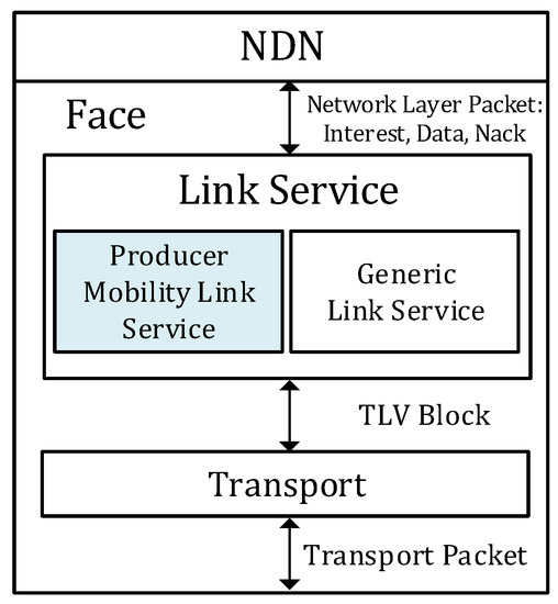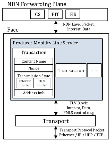 As shown in Figure 2, the PMLS is added at the link service to conceal the link breakage caused by the movement of the producer. The PMLS supports two additional functionalities: one is the re-establishment of the link and the other is the re-synchronization of the on-going transmission. To re-establish the connection, the PMLS at NAR has a special transport that accepts the connection recovery request from the PMLS at the NMP. When the NDN face of the NMP detects relevant movement, the PMLS sends the Face Update message to the peer PMLS via the special transport at the previous NAR. Then, both PMLSs create new transports to connect to each other.