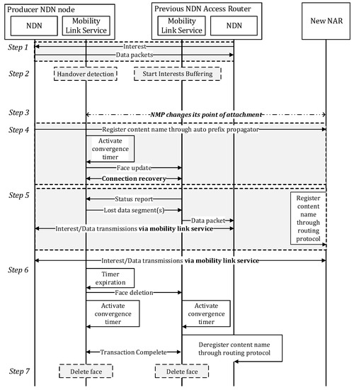 Figure 8 shows the NDN packet sequence at the NDN routers. Shown in Figure 8a, the pNAR continues to receive Interests from the consumer even though the NMP has moved to nNAR. After recovering the broken link with the NMP, the pNAR sends the buffered Interests to the NMP. Furthermore, it can be confirmed that the NDN data packets sent from the NMP are delivered to the consumer via pNAR until the routing information by the NLSR is propagated over the network.