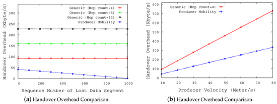 Figure 5b shows the handover overhead versus velocity (v). In original NDN mobility and PLMS, the handover overhead increases in direct proportion to increases in the vehicle speed, but the handover overhead of the original NDN mobility is higher than that of PLMS. This is because the signaling required for handover is limited to 1 hop in the case of PLMS, while the signaling required for original NDN mobility increases according to the number of hops between the consumer and the new NAR.