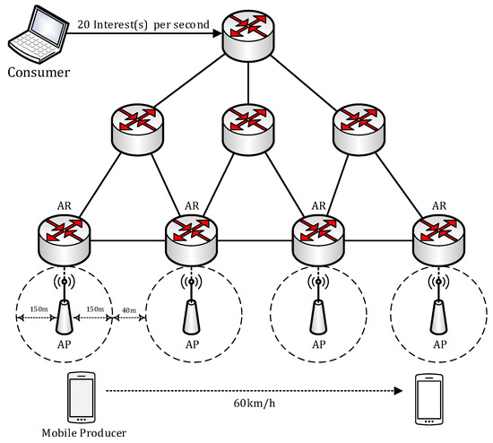 We used a modification of the ndnSIM 2.3 [36], an open source NS-3-based NDN simulator, to assess the handover performance of our proposed scheme. The PMLS is a subclass of the generic link service, so it provides all the services supported by the generic link service. It also handles the PMLS control messages to support link recovery. The ndnSIM 2.3 does not support any name-based routing protocol. We updated the FIB tables at the NDN routers within the network after the average OSPF convergence time (6 s) [37] has elapsed, since the NLSR, which is the default NDN routing protocol, is derived from the OSPF routing protocol. Figure 6 shows the network model used in this simulation. The NDN network uses the IPv4 network as its transport network. We assumed that the transport network supports the use of anycast-style addresses that route messages from consumer to the nearest NAR. This can be archived by statically installing anycast-specific route information to the default access routers of the IPv4 network. Each NAR is connected to an Access Point (AP) covers an area with a 150 m radius. The distance between two APs is 340 m, so there is a 40 m shadow area between two APs. The NMP moves to 60 km per hour with the constant velocity mobility model from AP 1 to AP 2 direction. Upon connecting to a new NAR (nNAR),), the NMP registers its content name prefixes before it receives the first Interest from the nNAR. The consumer sends 20 Interests per second (1 Interest every 50 ms). The hop count between entities is set to 1 and the link delay for each hop is set to 10 ms.