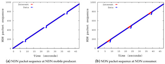 In the simulation investigation, we measured the NDN packet (Interest, Data) sequence in an effort to prove that the proposed scheme could prevent the loss of Interests even in the occurrence of a handover of the NMP. Figure 7a shows the Interest reception sequence at the NMP. The NMP receives the 140th Interest at 7.02015 s and it receives the 141st Interest at 9.46955. The figure shows that no loss of Interest occurred even though NMP moved from AP 1 to AP 2. There is a gap of 2.4494 s between the reception of the two Interests. The NMP takes 2.4 s to move out of the shadow area (40 m). The NMP and nNAR have a 49.5 ms interaction. In this time, they can exchange four control messages, as the link delay between them is 10 ms. This process is repeated each time the NMP encounters a new AP, as shown in Figure 7a.