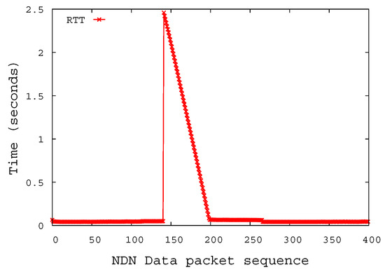 Figure 9 shows the Round-Trip Time (RTT) between the consumer sending the Interest packet and receiving the Data packet. The RTT increases up to 2.45909 s by the time the NMP is in the shadow area. As the NMP moves toward the center of the nNAR, the RTT decreases continuously. After the routing information is updated by the NLSR, the data packet reaches the consumer via the nNAR, not the pNAR. This was confirmed by the difference between the RTT of the 265th NDN packet and the RTT of the 266th NDN packet; the 265th and 266th Interests are forwarded to different NARs. The consumer sees that the RTT between sending the Interest and receiving the Data packet is reduced by 20 ms from 60 ms to 40 ms. This is due to the facts that the number of hops the data packet goes through is reduced by two and that each link delay is 10 ms.