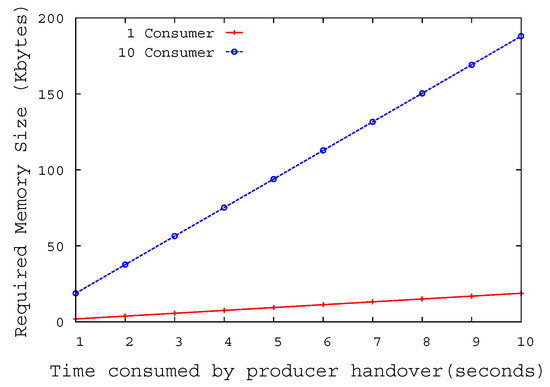 If the core router to have optimal performance under the constraint that the router’s buffer size must be small, the buffer size of the router must be greater than or equal to 2T C ÷ [38]. 2T means the Round-Trip Time between producer and consumer, and C stands for bottleneck link capacity between the router and producer. N is the number of flows which share a bottleneck link. We assumed that the capacity of the wired link is 1 Gbps and has a delay of 1 ms, and total 10 consumers send interest to the producer. According to the calculation in the simulation environment, the ideal buffer size required for NAR is about 316K bytes. Figure 10 shows the size of the required buffer according to the time it takes for the NMP to restore the connection with pNAR after the link down event occurs. When the pNAR must buffer the interests from 10 consumers for 10 s, the buffer size required for pNAR is 188K byte. Since the optimal buffer size calculated above is 316K bytes, pNAR could additionally buffer interests for about 20 s. However, as the pNAR cannot buffer interests indefinitely, it is necessary to choose a default value to determine how long to buffer the interests considering the distance between NARs.