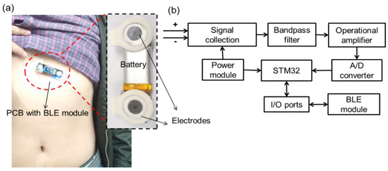 Wearable devices usually involve smart sensors to detect various parameters of the human body and remind the wearer or caregiver to take appropriate action [1,2]. With the advances in mobile technology and the great demand of the aging population for healthcare management, the emergence of wearable medical devices enables people to monitor their personal health information in real time [3,4,5]. Preventing diseases and avoiding emergency health risks are possible due to the feature of continuous monitoring. To date, many wearable healthcare devices provide body biosignals, such as blood pressure, blood glucose levels, body temperature, electroencephalograms, electrocardiograms (ECGs), and electromyograms (EMGs), for diagnosis [6,7,8]. ECG and EMG, which are caused by electrical signal variations during muscular activities, are important and commonly adopted parameters for healthcare management.