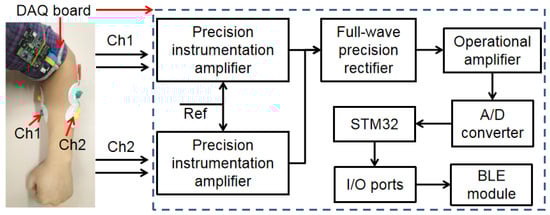 The hardware platform of the EMG system was built by using the STM32L152 chip and precision instrumentation amplifiers (AD8221, Analog Devices, Norwood, MA, USA), and a BLE module [43]. Two groups of EMG signals would be measured from differential electrodes on the FCR and the ECRL muscles. A two-channel block diagram of the EMG hardware test platform for forearm muscle monitoring is presented in Figure 3. The amplitude of the original EMG signals may vary from μV to mV, which is related to the dimension and the depth of the muscles contracting underneath the electrodes [44,45]. The different action potential signals from the FCR and the ECRL muscles are fed to the differential input of the precision instrumentation amplifiers. For the instrumentation amplifier, based on the classic three operational amplifier topology, an error current at the input stage is produced using two constant current biased transistors [46] and fed to precision current feedback amplifiers, and the amplified differential signal and signal from reference electrode can be received by the third operational amplifier at the inputs. Full-wave precision rectifiers, which are integrated for high-frequency noise filtering, are used to rectify the measured EMG signals. Operational amplifiers are applied to amplify the measured EMG signals again [47,48]. EMG signals are delivered to the A/D converter of the STM32L152 chip for digital DAQ, and the obtained data are sent to a remote receiver (such as smartphone or laptop) for the recognition of upper limb activities.
