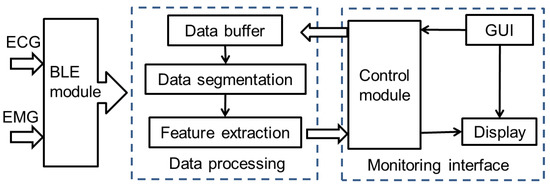 When the EMG and the ECG electrodes are attached to the selected muscles on the upper limb and the chest areas, respectively, the ECG/EMG devices works. The wearable monitoring system is then in operation, and the internal BLE modules are initiated on the circuit boards. The initial setup for calibration parameters was loaded to the registers of the STM32L152 chip. Figure 4 illustrates the software processing framework for the ECG/EMG data. The developed software simultaneously receives ECG/EMG data by connecting with two devices’ BLE modules via two incorporated configuration modes. The ECG or EMG values are read based on a communication protocol. The raw ECG or EMG values are processed and analyzed in accordance with the corresponding mathematical methods (introduced in Section 3), and the time-varying curves are displayed on the screen in real time. Considering the convenience and wide acceptance of smart phones, not only a computer software but also an APP software for the physiological monitoring system were developed to display rehabilitation information to users.