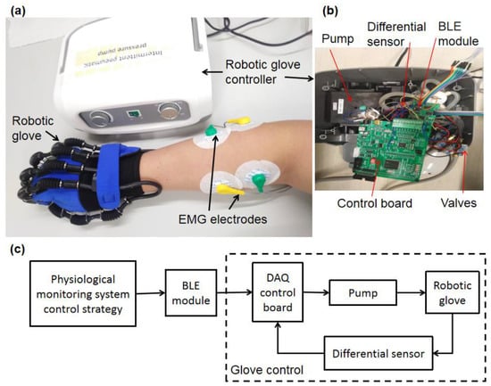 Moreover, the developed physiological monitoring system would be applied in a soft pneumatic robotic rehabilitation glove (SY-HR01C, Shanghai Siyi Intelligent Technology Co., Ltd., Shanghai, China) for hand rehabilitation training demonstration as shown in Figure 5. Monotonous and repetitive palm opening and closing movements [49,50] could be achieved by the robotic glove via pressure variation controlled by a controller (Figure 5b), which consists of a pneumatic pump (KPV04, max pressure 75 kPa, max air mass flow rate 2.0 LPM), a data acquisition control board (STM32 chip) with BLE module, differential pressure sensors (MPX5100DP, Freescale Semiconductor Co., Austin, TX, USA), and valves (SMC V124A, Sintered Metal Corporation, Shenzhen, China). The controller not only uses the fixed mode which set the working time and air pressure through the knob of box, but also connect with a professional software via the internal BLE module to realize the parameter setting. The BLE module receives the control strategy orders from the physiological monitoring system and delivers it to the control board for further analysis (Figure 5c). According to the control strategy, the pump starts producing pressure for the robotic glove to assist hand rehabilitation training. Differential pressure sensors monitor the pressure and offer pressure feedback to achieve precise control. During the rehabilitation training, the upper limb muscles (FCR and ECRL) are monitored by the EMG sensors, and the heart health status are monitored by the ECG sensor, which could real time adjust and give scientific guidance on control strategy for hand rehabilitation training. In this study, a healthy subject with normal hand postures was selected to ensure the reliability and the feasibility of the muscular activity experiment [51,52].