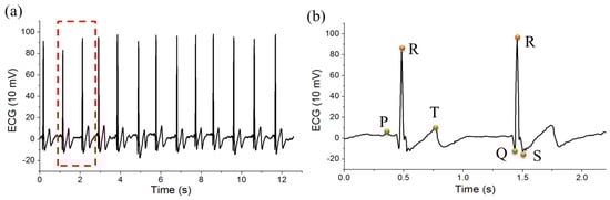 The QRS complex is closely associated with the depolarization of the right and the left ventricles of the human heart and the contraction of the large ventricular muscles, which is the basis of ECG feature analysis. The duration, amplitude, and morphology of the QRS complex are useful in diagnosing disease states (e.g., predicting cardiac arrhythmia and conduction abnormalities) [56,57]. For the QRS complex detection, the baseline data, peak value, and lowest value were taken as the “Q”, “R”, and “S” data, respectively. The wave peak points R, P, T, and the possible clutter peaks were marked to obtain the first-order difference for the ECG data sequence and then find the maximum points. These R, P, and T marks were shown in a section analysis (Figure 6b), which extracted from the raw ECG data plot (Figure 6a). Half of the maximum amplitude value of the detected maximum point was used as the threshold value because the amplitude of the peak value of the R wave was large, and the maximum value other than the peak value of the R wave was excluded. The threshold was set again on the time difference between the adjacent R waves on the basis of the traditional differential threshold method [54], and the singularity was removed by the minimum value of the R–R interval.