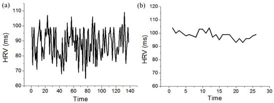 A support vector machine (SVM) is a supervised machine learning model that uses classification algorithms to deal with two-group (e.g., excited and fatigue) classification problems, which are trained using various R–R interval signals [62,63]. The initial time interval in experiment is used as a learning phase of SVM for each individual. Generally, the transition from the normal level to the fatigue status was related to a steady decline in pulse rate and associated with an increase in the HRV. When steady values in HRV are observed, the SVM can determine whether the person is experiencing fatigue, and the software system takes the necessary actions, such as alerting. Thus, long-time, safe, and moderate rehabilitation training can be guaranteed on the basis of such applications. In this experiment, one subject (male, 34 year, 76 kg, 170 cm, healthy) was involved as a demonstration example for repeated measurements and analysis. According to his subjective feeling, the excited status usually occurred in the morning, and the fatigue status occurred in the evening, thereby the data of excited and fatigue status were planned to be collected at 10:00 in the morning and 11:00 in the evening, respectively. The ECG data obtained in the excited and the fatigue status could be used to validate the SVM judgement. Figure 7a,b demonstrate the HRV values for the excited and the fatigue status, respectively, and revealed that the pitch of the HRV changes was irregular when the subject was in the excited status and became regular when the subject was in the drowsy status.