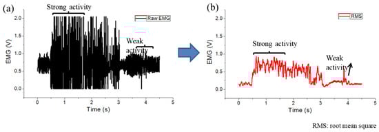 where N indicates the segment number (N = 200), and vi is the voltage at the i-th sampling. The RMS data were extracted from the raw EMG signal (Figure 8) to validate the algorithm. The feature of the raw EMG signal for the activity level of the muscle to be characterized can be determined using the calculated RMS values. The RMS value could reflect the level of the physiological activities in the motor unit during contraction. For weak muscle activity, the relationship between the activity intensity and the EMG signal had the same trend. For strong muscle activity, the same relationship did not correspond to the activity intensity variations, which needed another calculation method because the signal amplitude of muscle activity was saturated.