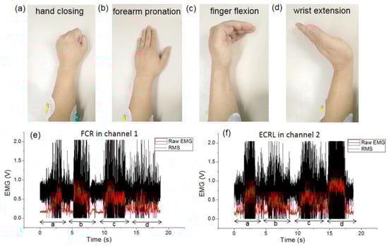 Segmentation process of EMG with two-channel monitoring in the FCR and the ECRL muscle positions: (a–d) designed hand motions; (e) FCR muscle monitoring in channel 1; (f) ECRL muscle monitoring in channel 2.