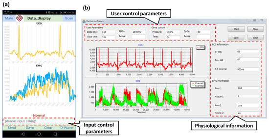The developed mobile application interface (Figure 10a) consisted of two graph panels and five main functional tabs, including “Scan”, “Send”, “Save”, “Clear”, and “D-wave”. The Scan function, the first tab, is for scanning the broadcasting BLE devices and establishing connection with one. The Send function, the second tab, is for communicating with the respective PCB for the user’s control parameters transmission (such as data collection rate, glove working cycles, etc.). Data can be saved using the Save function and cleaned using the Clear function. The D-wave function, the fifth tab, is for finding the peaks of the data curves. Graph panels include the data display and the graph depict function. The graph depict plots a view of the accumulative ECG or EMG data along with the time to visualize the relevant physiological characteristics variation of subject in real time. In this program, two timers were responsible for working smoothly. One timer was responsible for receiving data, and the other timer was responsible for processing and display.