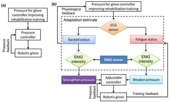 According to ECG monitoring, a significant variation occurred in HRV when people started with an excited status, and the HRV variation was small when people started with a fatigue status. Although the number of subject and relevant data were limited and cannot represent all, such findings have already been demonstrated by previous studies [59,60,61]. With regard to the EMG analysis, when comparing the variation amplitudes between the excited and fatigue status, the intensities of muscle activity in excited status were greater than that in fatigue; when comparing the variation amplitudes between the first and last training bout, the intensities of muscle activity were perceived to significantly decrease along with the training time. These findings indicated that the muscle performance level was closely associated with the psychological fatigue level that may significantly influence the rehabilitation training effects. Thus, it is better to undergo rehabilitation training in the excited status and adopt the developed system for real time physiological monitoring to ensure the training efficacity. Traditional glove assisting training without physiological monitoring could not provide adaptive control for the glove to improve rehabilitation training, as shown in Figure 11a. To optimize control performance of the robotic glove for improving rehabilitation training and refer to some related adaptive control methods in similar studies [67,68,69,70], an adaptive control strategy was induced into the glove control system as presented in Figure 11b. For instance, if the HRV variation of 10 consecutive measurements less than 5 ms was considered as the fatigue level which matched the subjective judgement of the subject, the ECG sensors could then easily determine whether the user is in the excited or fatigue status based on the monitored data. In this case, once the user was in the fatigue status, the pressure of the pneumatic glove would be weakened to protect muscles from secondary injuries, and when the user was in the excited status, the pressure would be strengthened to increase training intensity gradually. Meanwhile, the intensity of muscle activity could also be predetermined as control parameters (e.g., ECRL muscle activity intensity = 1.5 V) to perform a certain motion task. According to the monitored intensity variation of muscle activities, the difference between the predetermined and detected EMG data could offer adaptive commands to the pneumatic robotic glove for pressure adjusting in order to maintain the predetermined performance level. Thereby, the developed training device with an adaptive control strategy could enable users to perform rehabilitation exercises easily and sustain the training endurance.