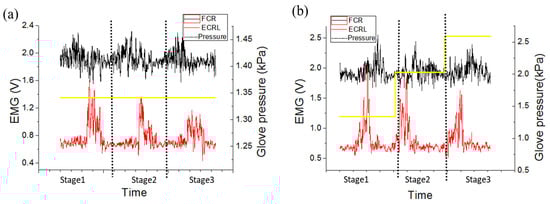 To further evaluate the feasibility and usability of the developed physiological monitoring system in practical use with the implemented device, a soft robotic rehabilitation glove was adopted as an application for testing. The experiment was carried out in two situations—when the subject (good sleep last night, get up at 7:00 in the morning, and keep awake till evening test) was in the excited status and in the fatigue status. Data of the excited status were collected at 10:00 am, while data of the fatigue status were obtained at 11:00 pm. EMG data were collected from selected muscles at three different stages for analysis as shown in the Table 1.