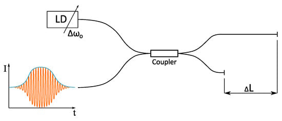 The proposed OFS signal generator is shown in Figure 2. It consists of an unbalanced fiber interferometer (Michelson or Fabry–Perot interferometer), which allows a compact and robust device realization, a single DFB laser diode, and a current pulse generator utilized for a fast OFS of the DFB laser diode. Based on Equation (8), the theoretical maximal generated frequency f with the proposed signal generator is limited to THz at overlap efficiency factor . Optical Frequency modulated signals were detected using the Keysight N7004A optical detector and UXR0334A oscilloscope.