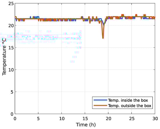 where is the temperature change and is the thermo-optical coefficient. It should be stressed that a typical value of for silica-based optical fibers is in order of . With the change of temperature for 10 K, changes to the are in the order of at m. Mathematical model Equation (4) shows that in optical fiber interferometer with longer OPDs there is no significant impact on the generated frequency by the change of temperature. The polarization and dispersion effects are very difficult to model. In the literature there has not been extensive research made on environmental impacts on optical fiber interferometers with ultra-long OPD. Based on that, we made a compromise and placed the interferometers into the isolated box. A temperature stability test was performed on an isolated box. The temperature on the inside and outside of the box was measured every 5 min for 30 h. The results are presented in Figure 5. Two temperature shifts were introduced into the temperature stability test. The temperature inside the box held both temperature swings for 30 min. It was concluded that the isolating box has sufficient temperature stability in the laboratory environment; therefore, the impact of temperature swings on the optical fiber interferometer should be minimal.