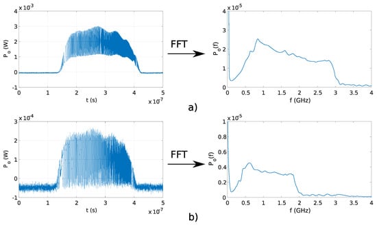 Complex waveforms can be generated using the proposed signal generator, if OFS rate is a function of time. The current pulse waveform for generating linear chirp was designed and used with Michelson fiber interferometer with OPD m and Fabry–Perot fiber interferometer with OPD m. Figure 11a,b shows the generated signals with Michelson and Fabry–Perot interferometers, respectively. The maximal frequency in signal, generated using the Michelson interferometer, was 3 GHz, and maximal frequency of the signal generated with Fabry–Perot interferometer was 2 GHz. The amplitudes of generated optical linear chirp signal decreases over time. Optical power, emitted from DFB laser diode, starts to drop with the rise of the temperature. The amplitude is gradually falling with rising frequency since higher frequencies are generated toward the end of the generated optical pulse.