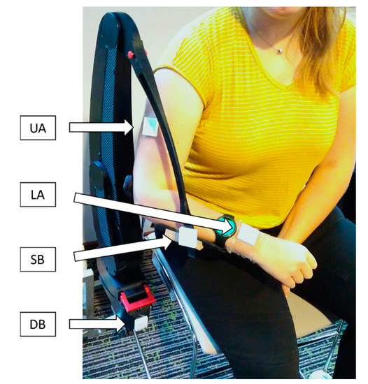 Measurement setup demonstration on a healthy volunteer. UA: Upper Arm, LA: Lower Arm, SB: Support Brace, and DB: Device Base.
