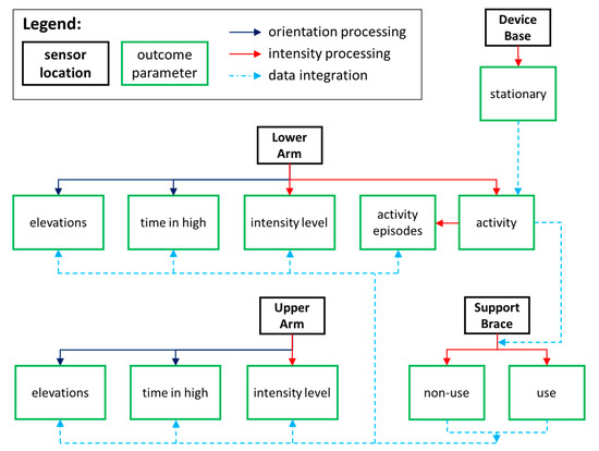 First, the tri-axial accelerations were filtered with a fourth order Butterworth 0.025 to 7.5 Hz band pass filter to calculate the intensity for each sensor (Appendix A, Figure A2, Figure A3, Figure A4 and Figure A5). A threshold (1.125 counts/s) was determined during system calibrations to distinguish between still and motion based on the collective sensor noise level of a one-minute recording while sensors laid still and a one-minute recording of slow movements. Furthermore, we have verified the threshold with participant data and found the threshold to clearly distinguish between resting periods and activity bouts, also over longer periods of time. All intensity data were categorized per second as still or motion and corrected for non-stationary periods of the device’s base as still. The lower arm sensor determined the periods of activity (motion). Within active periods, the support brace sensor determined the periods of DAS non-use (still) and use (motion). The periods of activity, non-use, and use were expressed as cumulative minutes per day. Furthermore, the intensity levels of non-use and use were extracted for the upper and lower arm and period occurrences of non-use and use for the lower arm only. The intensity levels were expressed as cumulative counts per day and the period occurrences (episodes) counted per day. The intensity data processing resulted in the outcome parameters periods of activity, non-use, and use, and the intensity levels and episodes of non-use and use of the upper and lower arm (Figure 2).