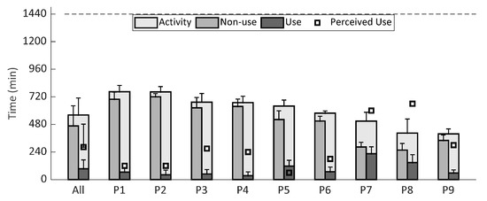 Averaged monitored daily activity, non-use, and use expressed in minutes as bars and perceived use as squares, both with one standard deviation. The dotted line represents a complete day. Participants were sorted on activity time in a descending order for visualization purposes.