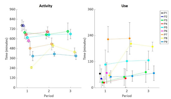 Participants perceived their averaged daily DAS use as more than monitored (p: 0.015) (Figure 3). Accelerometer data indicated that participants were on average active for roughly 561 ± 149 min a day of which 94 ± 77 min, or 18 ± 15%, was with a DAS (Figure 3). In contrast, participants reported an average of 430 ± 280 min being active a day of which 283 ± 212 min, or 74 ± 31%, with a DAS (Appendix A, Table A2). Furthermore, participants showed consistent activity and DAS use over time, except for P8 where the first period was lower (p < 0.010) compared to the latter two (Figure 4). The participant had stated in the diary to be ill and not very active in that period.