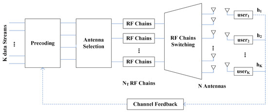 Recently, massive multi-user multiple-input multiple-output (MU-MIMO) systems [1,2,3,4] have been considered to have significant potential to play an important role in the 5G as well as the coming 6G wireless networks [5,6] due to the capability of increasing communication reliability and/or bandwidth efficiency. However, in conventional full MIMO systems, multiple radio frequency (RF) chains are utilized, which may substantially increase the power consumption and hardware costs. In particular, massive MU-MIMO systems usually employ hundreds of RF chains, while the number of RF chains in practical systems is usually limited. Antenna selection (AS) techniques are capable of retaining MIMO advantages, while achieving low system complexity and reducing hardware costs. In AS aided MIMO systems, the number of RF chains is fixed while additional antennas may be utilized for selecting a subset of MIMO channels, which are in better channel conditions, to realise the maximum system signal-to-noise (SNR) or MIMO channel capacity and, therefore, to provide additional performance gain to MIMO systems.