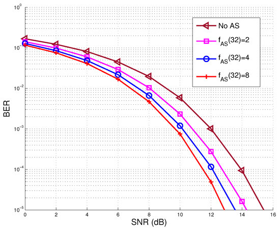 In this section, we represent the simulation results from MATLAB and measurement results from the NI SDR MIMO platform of the proposed AS aided MU-MIMO and UOSTxAS schemes. The transmitted signal power was normalised to unity and, thus, the SNR became . All of the simulation results were averaged over 10,000 channel realizations, and 16-QAM modulation was adopted. Furthermore, let us define the AS factor in Equation (14).