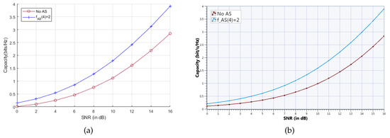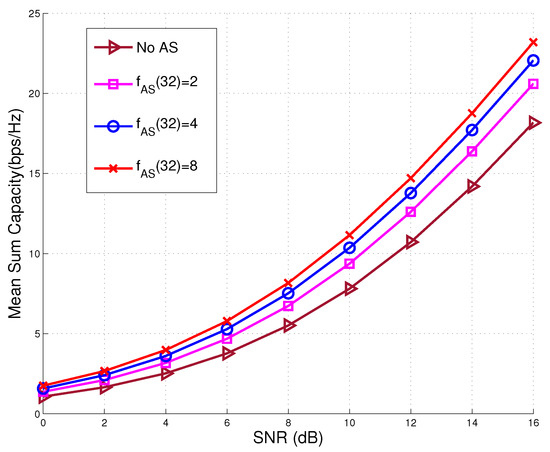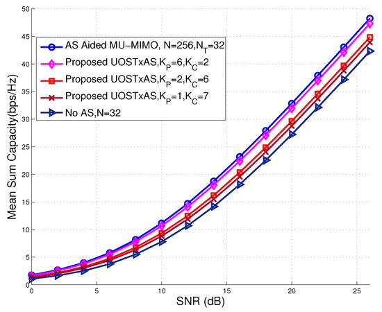 It may be seen that the system of without AS achieved the BER level of at around dB, while with , associated with an AS factor of , the system reached the same BER level at around dB, where a performance gain of 1.1 dB may be achieved. Moreover, when we further increase the number of TAs to , yielding an AS factor of , the system reached the BER level of at around dB, implying that 2.4 dB performance gain was successfully achieved compared to the performance of the conventional MU-MIMO system without AS. The achievable sum capacity performance of MU-MIMO systems associated with active users, transmit RF chains and TAs is depicted in Figure 4. It is seen that that the sum capacity performance may be improved by increasing the number of TAs. More explicitly, in the case of no AS, the sum capacity of the MU-MIMO system at dB is approximately 14.2 bps/Hz, while, with the aid of AS scheme, i.e., associated with an AS factor of , a sum capacity of 16.4 bps/Hz may be achieved at the same SNR value, where a performance gain of about 2.2 bps/Hz is achieved. Moreover, when , a sum capacity of 18.7 bps/Hz is achieved, which is associated with a performance gain of 4.5 bps/Hz.