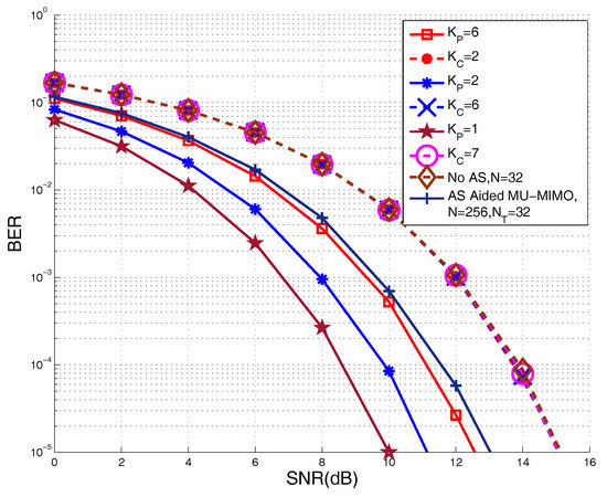 BER performance of proposed UOSTxAS system associated with active users, transmit RF chains, and various number of PUs and CUs, in comparison to that of conventional MU-MIMO without AS and AS aided MU-MIMO system.