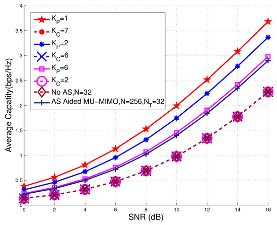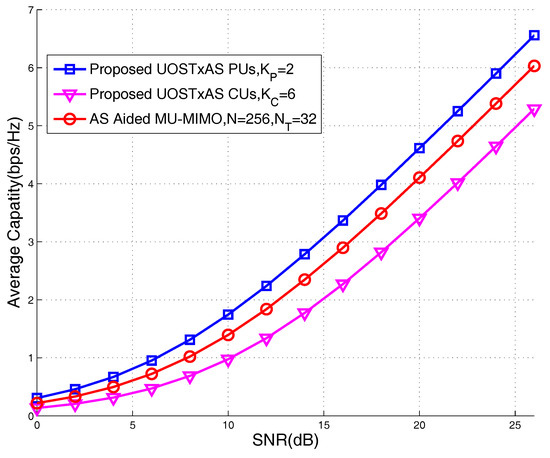 It is observed from Figure 6 that PUs generally achieve higher average capacity than that of CUs, since the AS in UOSTxAS is carried out based on PUs. Moreover, it may also be seen that as the number of PUs increases, the achievable capacity performance of per PUs is degraded. Additionally, we also include the achievable capacity performance of the conventional MU-MIMO with RF chains but without AS as an achievable capacity performance lower bound of MIMO systems. It can be seen from Figure 6 that, for PUs, higher average capacity performance may be achieved. Note that the similar conclusion can be drawn in Figure 5. Figure 7 shows the achievable capacity performance of the proposed UOSTxAS system that is associated with and AS aided MU-MIMO system. Both of the systems are equipped with transmit RF chains and transmit antennas supporting users. It can be seen that the PUs of UOSTxAS achieve better capacity performance than the users of AS aided MU-MIMO system. This is because, in UOSTxAS, the AS performance gain is averaged out by less users than that of the AS aided MU-MIMO system. Additionally, we may also see from Figure 7 that CUs generally achieve lower capacity performance than that users of the AS aided MU-MIMO system, since, in the UOSTxAS system, the AS scheme may be seen as the random AS for CUs.