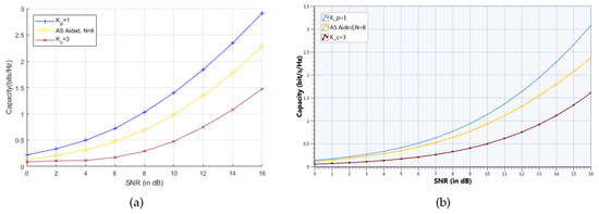 Achievable capacity performance comparison of proposed UOSTxAS in case of , and AS aided MU-MIMO systems associated with active users, transmit RF chains. (a) Simulation result from MATLAB. (b) Measurement result from NI SDR platform.