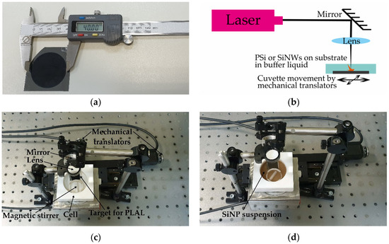 - Rioux, D.; Laferrieère, M.; Douplik, A.; Shah, D.; Lilge, L.; Kabashin, A.V.; Meunier, M.M. Silicon nanoparticles produced by femtosecond laser ablation in water as novel contamination-free photosensitizers. J. Biomed. Opt. 2009, 14, 021010. [Google Scholar] [CrossRef]
