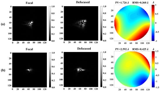 For simulating atmospherically distorted wavefronts, firstly, the independent random Karhunen–Loeve coefficients with the atmospheric conditions can be computed, then be converted to Zernike coefficients according to the Karhunen–Loeve Zernike expansion [25]. Each set of Zernike coefficients can be used to generate the corresponding phase pattern via the Zernike polynomial, which are loaded on the SLM to distort the wavefront. The first and second Zernike coefficients are both set to zero to exclude the tip-tilt. The Camera is displaced at the focal plane of L to detect the focal intensity images. For detecting defocused intensity images, we add an additional defocused aberration whose peak to valley (PV) value is equal to one wavelength. In this paper, there are a total of 6000 pairs of samples in the training data sets, 1000 pairs of samples in the validation data sets, and 3000 pairs of samples in the test data sets. Each pair consists of a group of Zernike coefficients as the label and the corresponding focal and defocused images as the input. Two examples of data sets are shown in Figure 2.