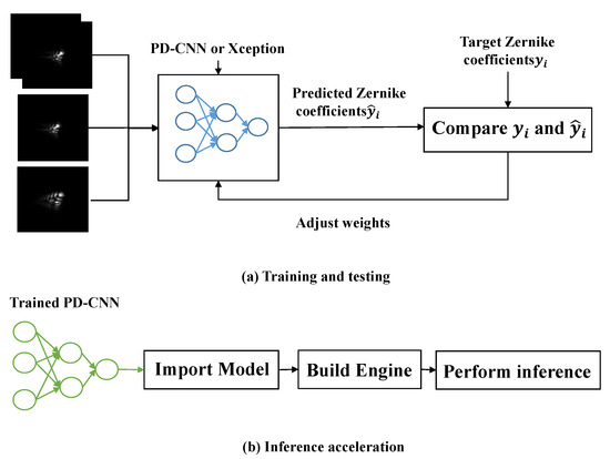 The experiment in this paper consists of two parts, training and testing neural networks and inference acceleration, as (a) and (b) shown in Figure 4. The purpose of part (a) is to obtain a trained optimal model for phase retrieval. The purpose of part (b) is to explore the advantages of the trained optimal model in real time. In part (a), the difference of training and testing neural network is that testing does not need to adjust weights. In the process of training, the neural network, the weights are adjusted by comparing predicted Zernike coefficients and target Zernike coefficients . Once the neural network is well trained, we can save the weights of the network then do the inference. For comparison, we use PD-CNN and Xception to restore wavefront. For each network, three sets of contrast experiments are set as follows, inputting the focal and defocused intensity images separately, and inputting the focal and defocused intensity images at the same time. Finally, we explore inference acceleration of PD-CNN models on embedded platforms Jetson AGX Xavier and 1080Ti. Part (b) shows the workflow of TensorRT5.0 used in this paper. There are three steps, as described in Section 3.2. The input is a trained optimal model of PD-CNN.